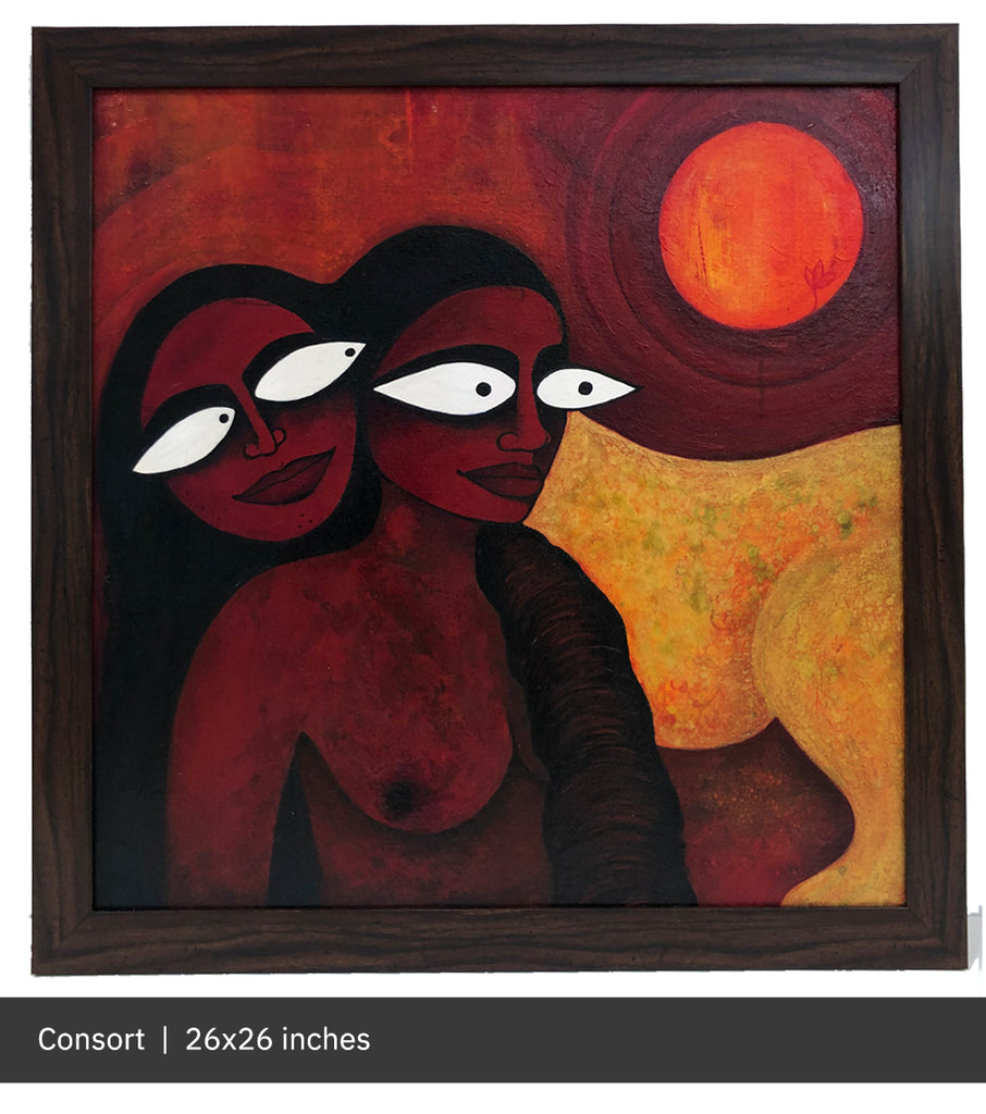 The idea for this one came to me during a week in Calcutta during Durga Pujo 2019. On one level this could be seen as the goddess and her eternal companion, her vahana, together. Am sure there are many more ways of looking at this painting.
